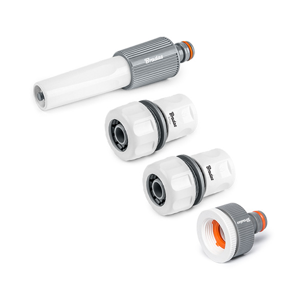 Πλήρες σετ ποτίσματος BRADAS. Το σετ περιλαμβάνει τέσσερα εξαρτήματα για σωλήνες νερού 3/4”, εκτοξευτήρα ρυθμιζόμενου ψεκασμού, ρακόρ θηλυκό 1”-3/4” κατάλληλο για κάνουλες, ταχυσυνδέσμο με aqua στοπ για τη πλευρά του εκτοξευτήρα και ταχυσυνδέσμο απλό για τη πλευρά της βρύσης. Χρώματος λευκό με γκρι