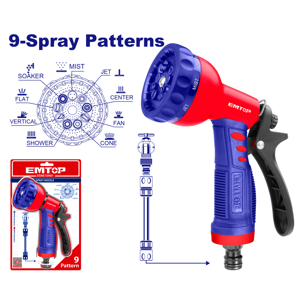 EMTOP πιστόλι ποτίσματος με 9 λειτουργίες ψεκασμού (ντους, γωνία, κέντρο, ανεμιστήρας, κώνος, τζετ, ομίχλη, μούσκεμα, επίπεδο).