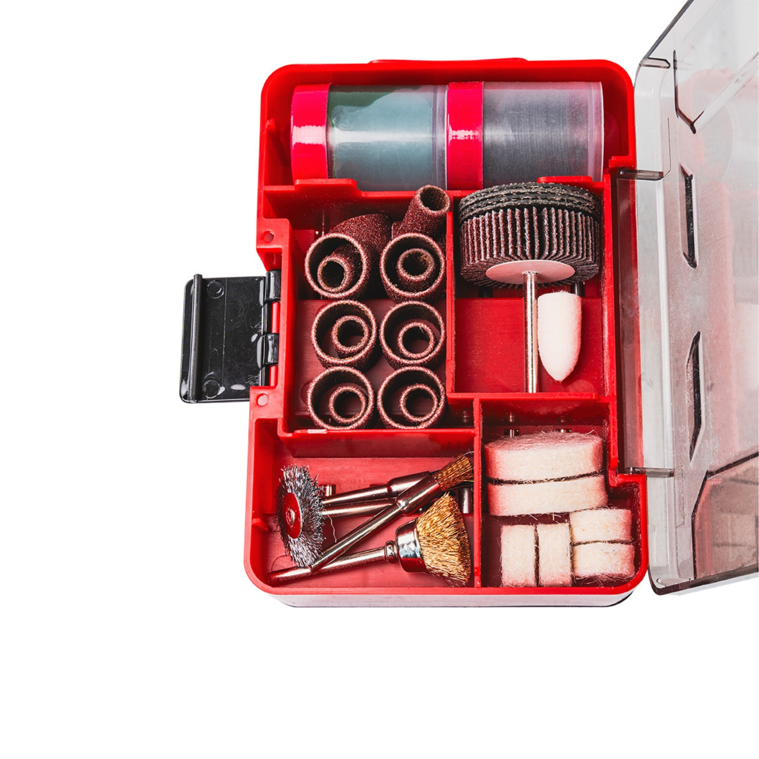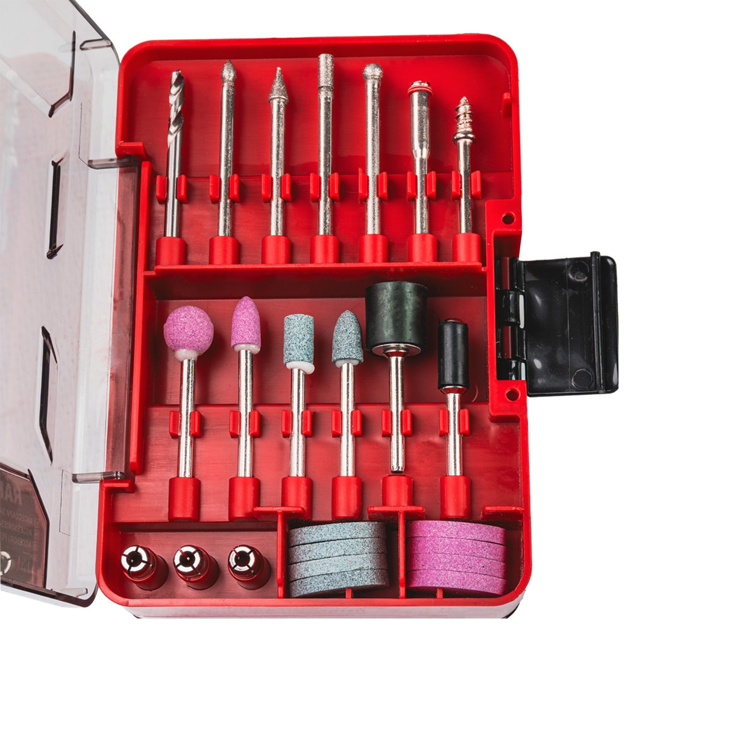 Περιλαμβάνει λειαντικές πέτρες και δίσκους λείανσης για διαμόρφωση και φινίρισμα επιφανειών, μύτες χαρακτικής για λεπτομερείς εφαρμογές σε ξύλο, μέταλλο και γυαλί, δίσκους κοπής για μέταλλο, ξύλο και πλαστικό για ακριβή κοπή, τροχούς στίλβωσης για φινίρισμα και λάμψη, συρμάτινες βούρτσες για αποτελεσματικό καθαρισμό επιφανειών και ιμάντες λείανσης σε διάφορα μεγέθη και κόκκους για μεγαλύτερη ευελιξία. Το σύνολο είναι άριστα οργανωμένο σε μία κασετίνα διευκολύνοντας τη χρήση και αποθήκευση. Είναι διπλής όψης organizer για εύκολη αποθήκευση και πρόσβαση.