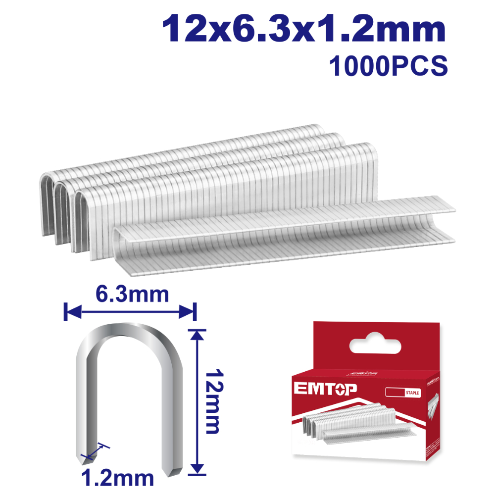 "EMTOP δίχαλα για καρφωτικό χειρός. 1000τμχ/κουτάκι Κατάλληλο για το εργαλείο: ESGU1001 Πάχος: 1.2mm Μήκος: 6.3mm Ύψος: 12mm"