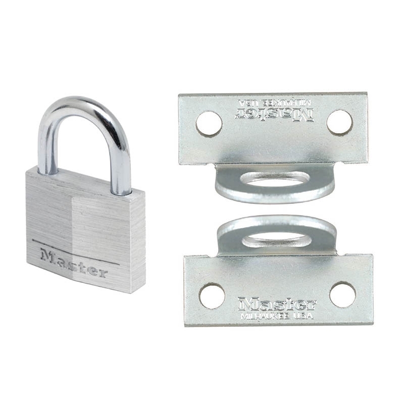 Το σετ της Masterlock διαθέτει λουκέτο αλουμινίου με κλειδί 40 mm και 2 θηλιές ορθής γωνίας για το κλείδωμα με λουκέτο.