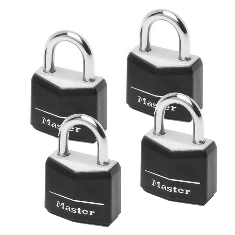 Σετ από 4 λουκέτα με κάλυμμα προστασίας και ασορτί κλειδιά της MASTERLOCK. Το λουκέτο διαθέτει ένα καλυμμένο σώμα κλειδαριάς από συμπαγές αλουμίνιο πλάτους 20mm που αποτρέπει τις γρατσουνιές και αντιστέκεται στη διάβρωση. Ο λαιμός διαμέτρου 3mm έχει μήκος 11mm και είναι κατασκευασμένος από χάλυβα, προσφέροντας αντοχή στην κοπή και το πριόνισμα.