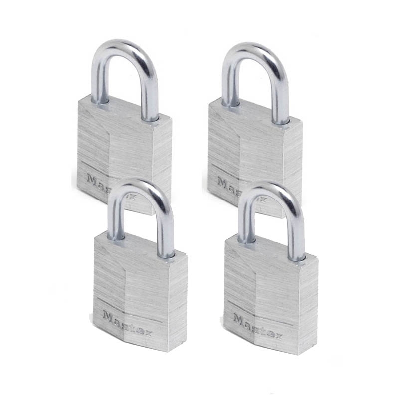 Σετ από 4 λουκέτα αλουμινίου 20mm με ίδιο κλειδί της MasterLock. Διαθέτουν σώμα κλειδαριάς από συμπαγές αλουμίνιο πλάτους 20mm που είναι ανθεκτικό και αντιστέκεται στη διάβρωση. Ο λαιμός διαμέτρου 3mm και μήκους 11mm είναι κατασκευασμένος από σκληρό ατσάλι, προσφέροντας επιπλέον αντοχή στην κοπή και το πριόνισμα. Ο μηχανισμός κλειδώματος με κύλινδρο 3 ακίδων αποτρέπει την διάρρηξη και οι διπλοί μοχλοί ασφάλισης παρέχουν αντίσταση κατά της σφυρηλάτησης.