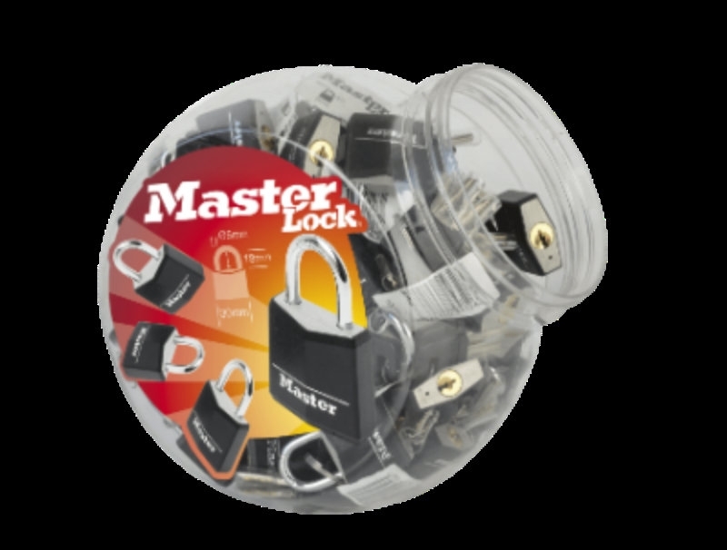 Βάζο που περιέχει 48 τεμάχια λουκέτα αλουμινίου 30mm με προστατευτικό κάλυμμα και 3 ασορτί κλειδιά, MASTERLOCK