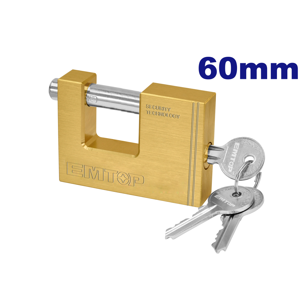 "EMTOP λουκέτο ορειχάλκινο σε σχήμα τάκο. Σφυρήλατος ορειχάλκινος λαιμός για αντοχή σε επιπλέον κοπή & στη διάβρωση. Οδοντωτός κύλινδρος ασφαλείας 5 ακίδων για μέγιστη αντοχή στη διάτρηση.