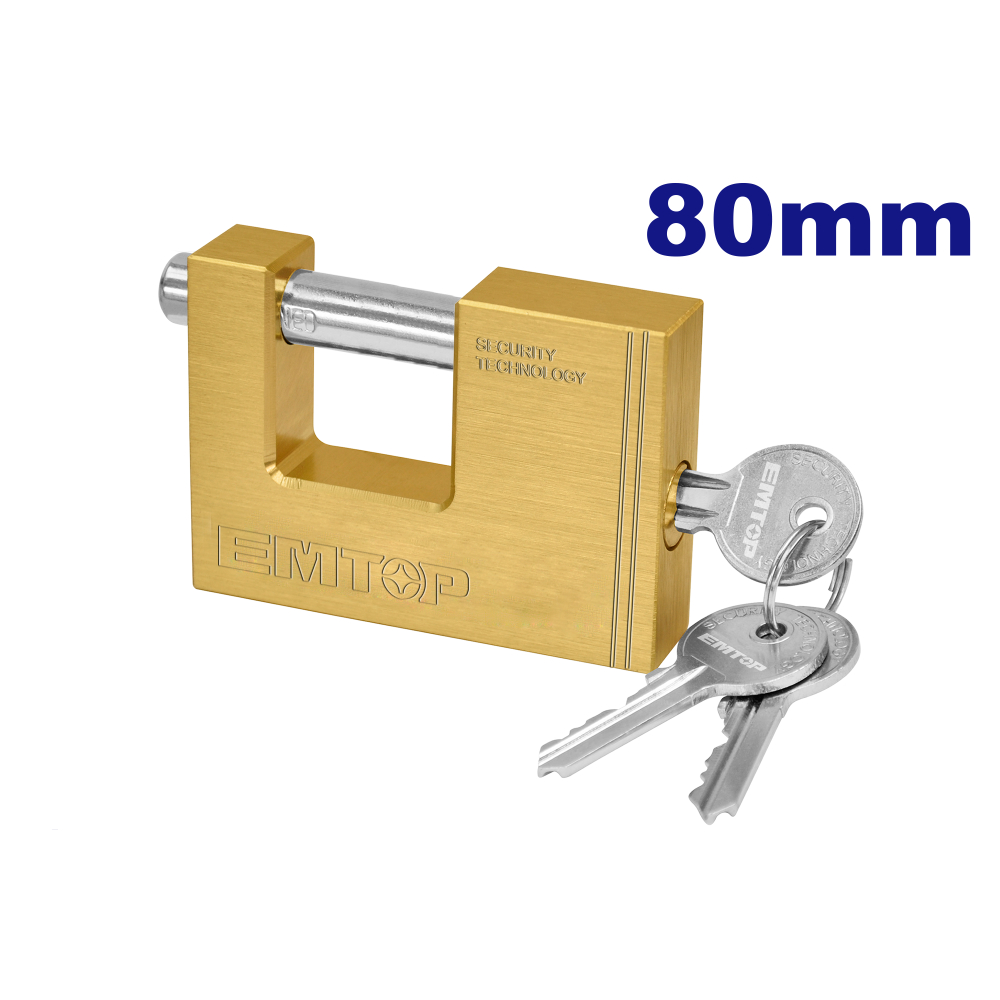 "EMTOP λουκέτο ορειχάλκινο σε σχήμα τάκο. Σφυρήλατος ορειχάλκινος λαιμός για αντοχή σε επιπλέον κοπή & στη διάβρωση. Οδοντωτός κύλινδρος ασφαλείας 5 ακίδων για μέγιστη αντοχή στη διάτρηση.