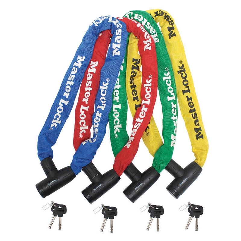 Η ατσάλινη αλυσίδα με κλειδαριά σε διάφορα χρώματα της Masterlock έχει μήκος 90 cm και διαθέτει ενισχυμένους χαλύβδινους συνδέσμους διαμέτρου 8 mm, που προσφέρουν αντοχή στην κοπή και το πριόνισμα. Το νάιλον χιτώνιο παρέχει πρόσθετη προστασία για τον εξοπλισμό από γρατσουνιές. Η κυλινδρική κλειδαριά δίσκου παρέχει αντίσταση κατά της κλοπής. Τα φωτεινά χρώματα απλοποιούν την αναγνώριση της μηχανής.