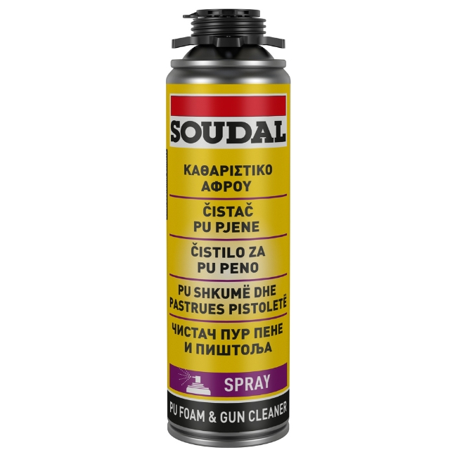 Καθαριστικό πολυουρεθάνης της Soudal, ιδανικό για τον εύκολο και γρήγορο καθαρισμό νωπών υπολειμμάτων πολυουρεθάνης από επιφάνειες και εργαλεία.
