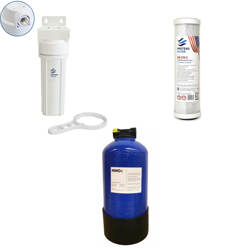 To σύστημα αυτό αποτελείται από μια στήλη ρητίνης χωρητικότητας 4,7L με 4L ρητίνη αποσκλήρυνσης food grade με κεφαλή 2 1/2\"-1/2\", φιλτροθήκη λευκή 10\"-1/2\" με ορειχάλκινο σπείρωμα και φίλτρο ενεργού άνθρακα από κέλυφος καρύδας Proteas SM 10\"-5μm.