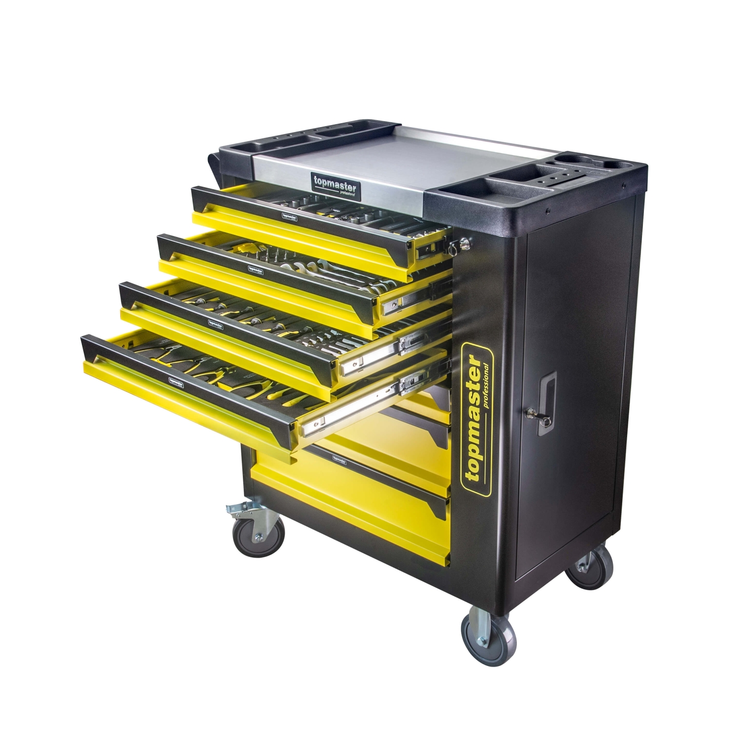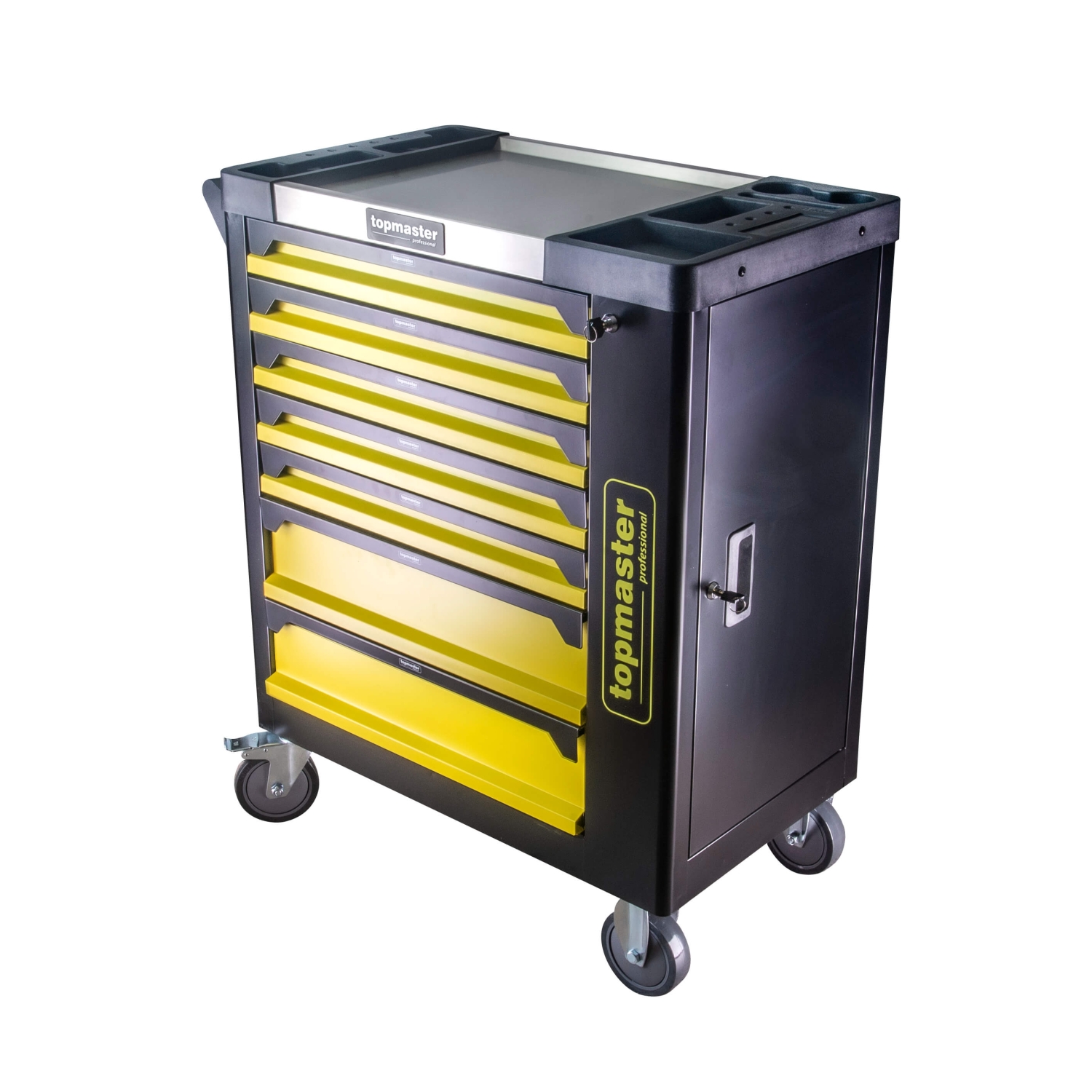 Ο τροχήλατος εργαλειοφόρος TOP MASTER με 7 συρτάρια είναι ιδανικός για επαγγελματίες. Διαθέτει στιβαρή μεταλλική κατασκευή, 550kg αντοχή και 182 εξαρτήματα. Έχει κεντρικό κλείδωμα, μηχανισμό αποτροπής τυχαίου ανοίγματος, εργονομική λαβή και ροδάκια PVC/PP. Η ανοξείδωτη επιφάνεια με 5 θήκες και η πλαϊνή πόρτα προσφέρουν επιπλέον αποθήκευση.