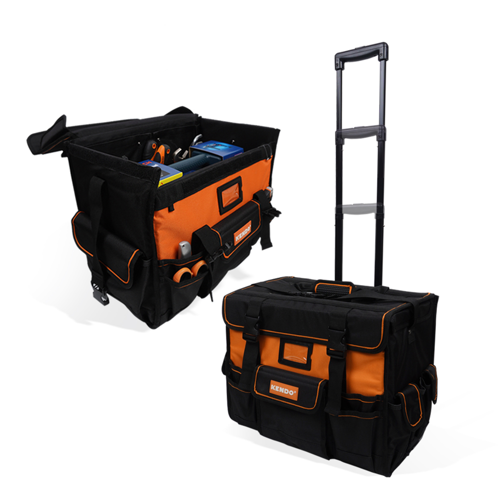 Τσάντα εργαλείων για τρόλεϊ βαρέως τύπου με 8 εσωτερικές και 9 εξωτερικές τσέπες. Λαβή με επένδυση για βαρύ κράτημα και ροδάκια τρόλεϊ.