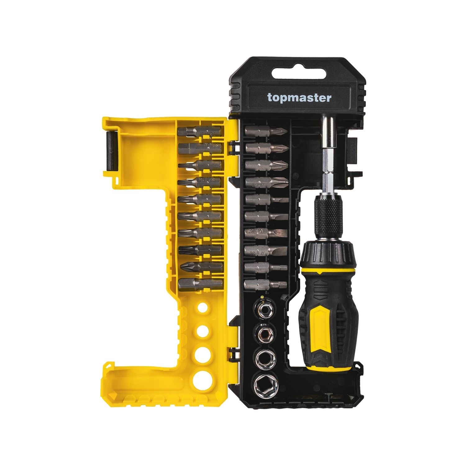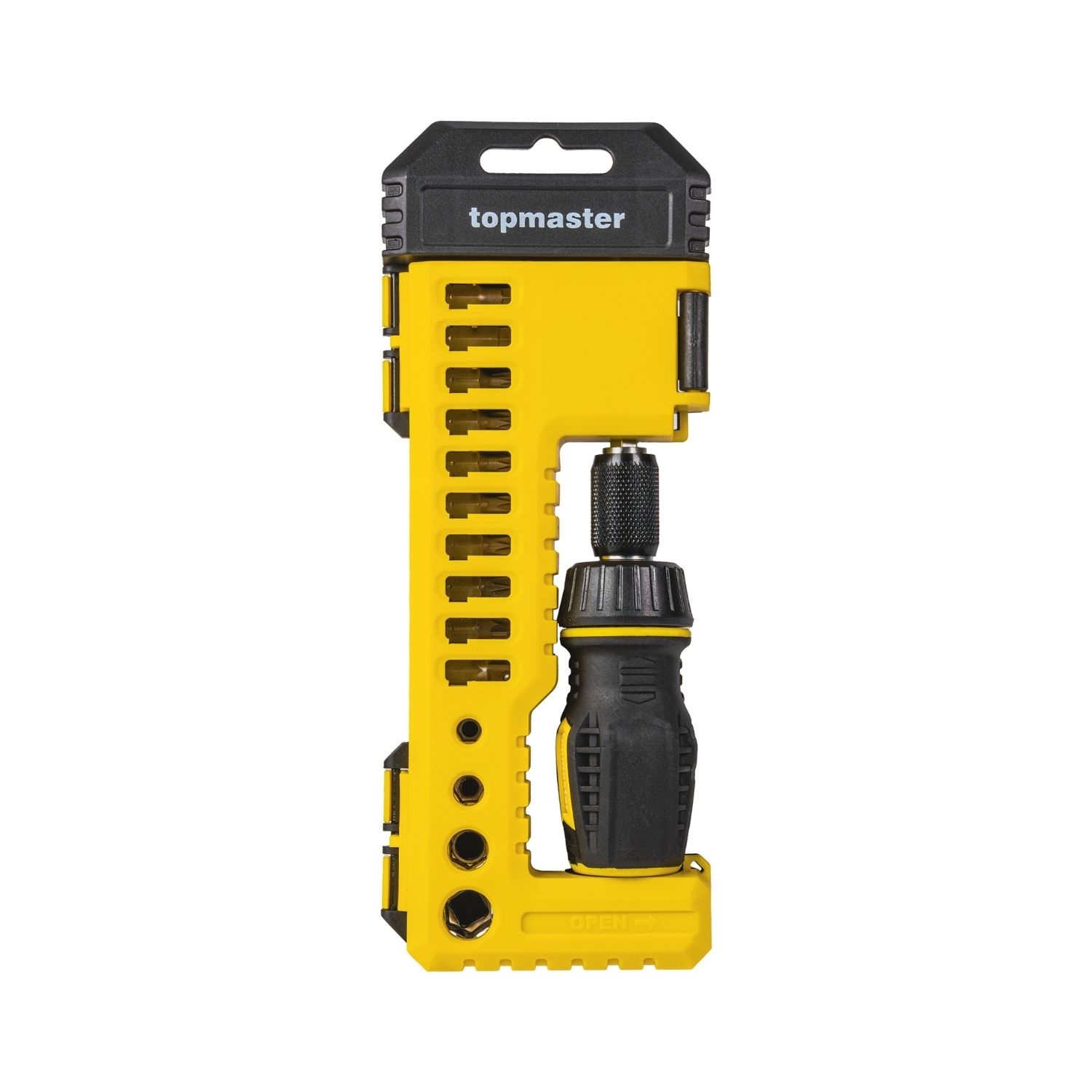 Το κατσαβίδι καστάνιας TOP MASTER με 19 μύτες αποτελεί μία πλήρη και ευέλικτη λύση για επισκευές και τεχνικές εργασίες. Το σετ περιλαμβάνει ποικιλία εξαρτημάτων όπως μύτες S2 υψηλής αντοχής, αντάπτορα, μαγνητική προέκταση και καρυδάκια, προσφέροντας ευχρηστία και πρακτικότητα σε κάθε επαγγελματία ή ερασιτέχνη. Η καστάνια διαθέτει μηχανισμό 32 δοντιών που διευκολύνει την ταχεία και άνετη εναλλαγή μεταξύ βιδώματος και ξεβιδώματος, ενώ η εργονομική λαβή με επένδυση καουτσούκ διασφαλίζει άνεση και σταθερό κράτημα ακόμα και μετά από πολύωρη χρήση.