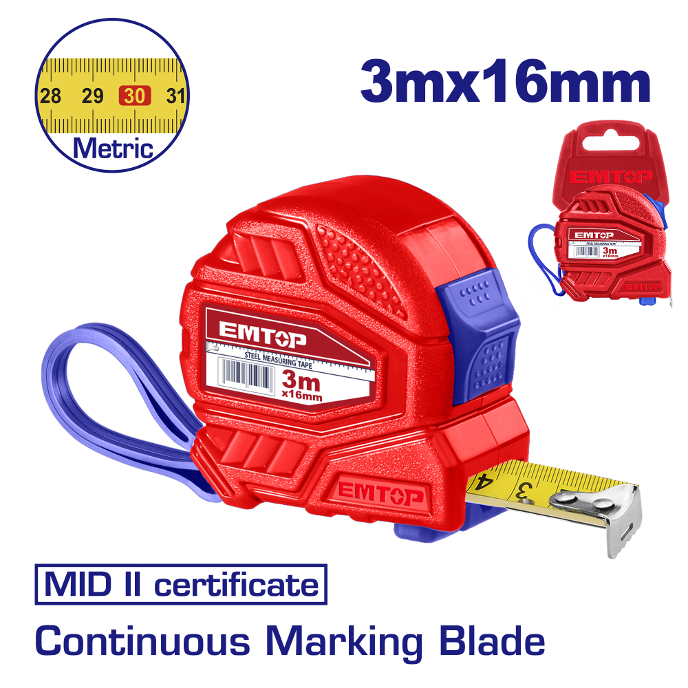 "EMTOP μετροταινία συνολικού μήκους 3m και πάχος λάμας 16mm. Εξωτερικό περίβλημα κατασκευασμένο από ABS υλικό.