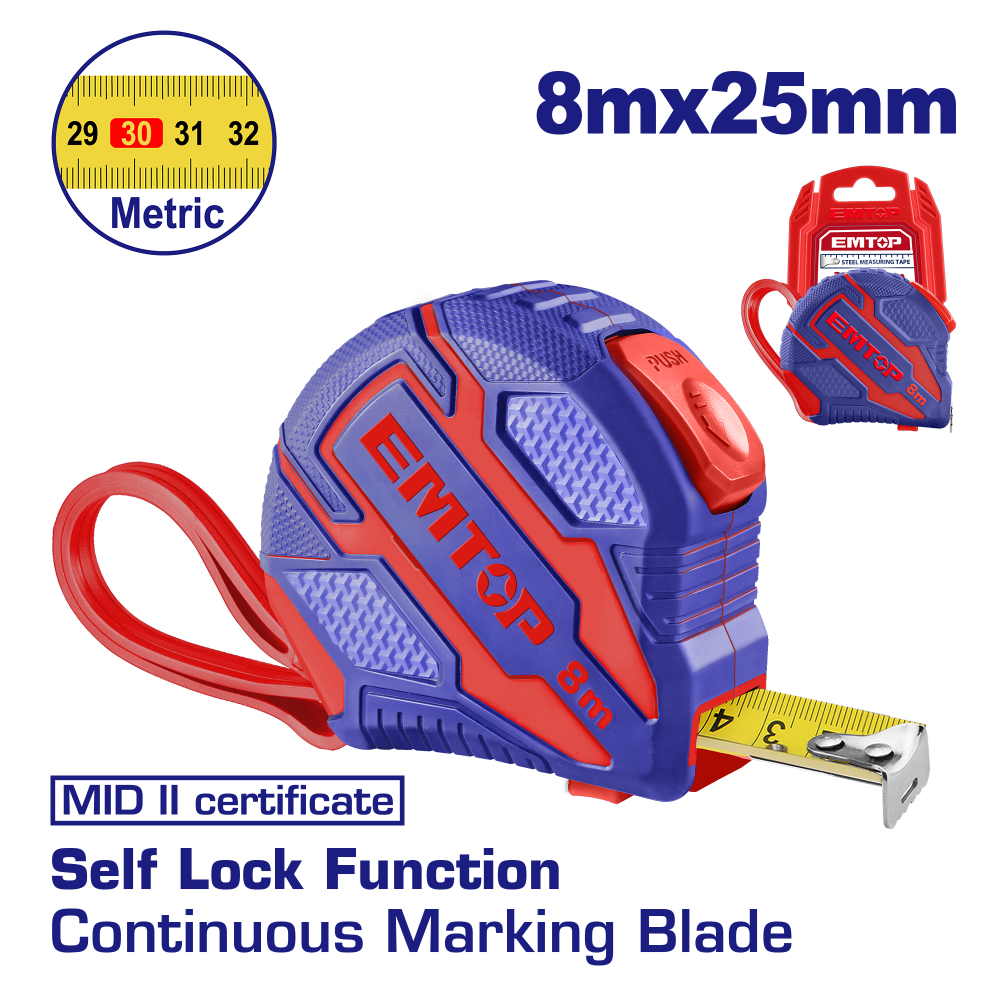 "EMTOP μετροταινία συνολικού μήκους 8m και πάχος λάμας 25mm. Εξωτερικό λαστιχιένο περίβλημα ανθεκτικό στην τριβή και την απορρόφηση κραδασμών.