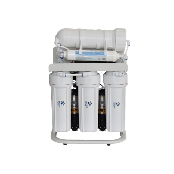 Σύστημα αντίστροφης όσμωσης, 6 σταδίων με αντλίες παραγωγής 90l/h. Διαθέτει 3 πρόφιλτρα (φίλτρο πολυπροπυλενίου 10″ - 1μm, φίλτρο κοκκώδους ενεργού άνθρακα 10″, φίλτρο συμπαγούς ενεργού άνθρακα 10″ - 5μm), δύο μεμβράνες αντίστροφης όσμωσης 3012-300GPD παραγωγής 46l/h, φίλτρο βελτίωσης γεύσης και οσμής του νερού.