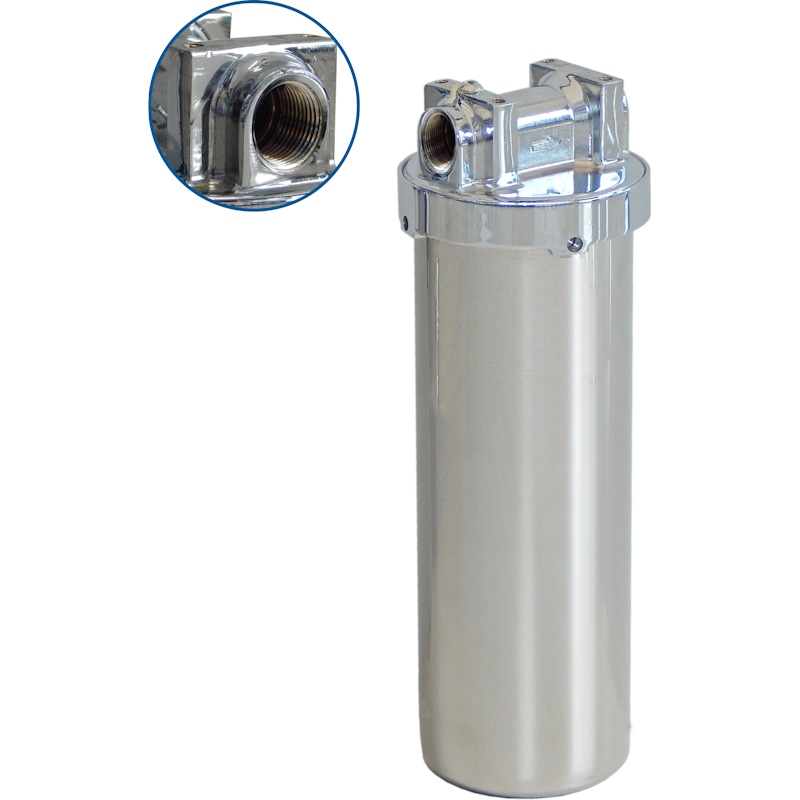 Η μονή μεταλλική φιλτροθήκη τριών μερών είναι κατάλληλη για εγκατάσταση στην κεντρική παροχή του νερού αλλά και κάτω από τον πάγκο της κουζίνας