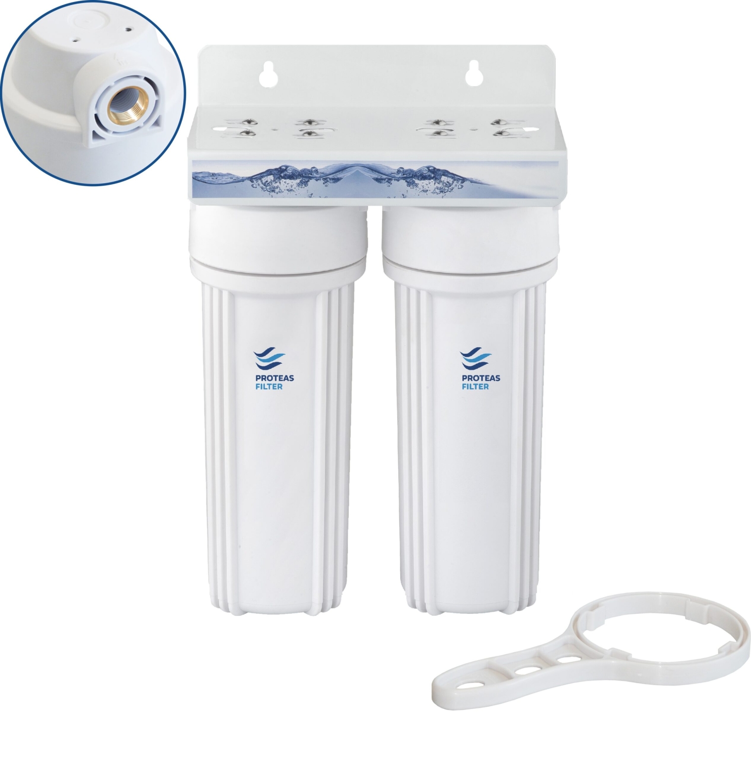 Διπλή φιλτροθήκη δύο μερών λευκή πλαστική 10″ - 1/2″ με ορειχάλκινο σπείρωμα.