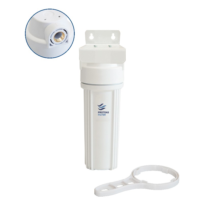 Μονή φιλτροθήκη δύο μερών λευκή πλαστική 10″ - 1/2″ με ορειχάλκινο σπείρωμα.