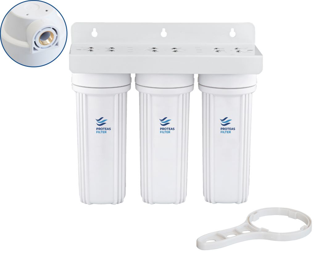 Τριπλή φιλτροθήκη δύο μερών λευκή πλαστική 10″ - 1/2″ με ορειχάλκινο σπείρωμα.