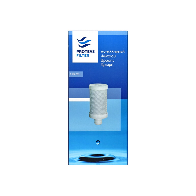 Συσκευασία τεσσάρων ανταλλακτικών φίλτρων για το φίλτρο βρύσης χρωμέ Proteas (EW-011-0100). Περιέχει ενεργό άνθρακα.