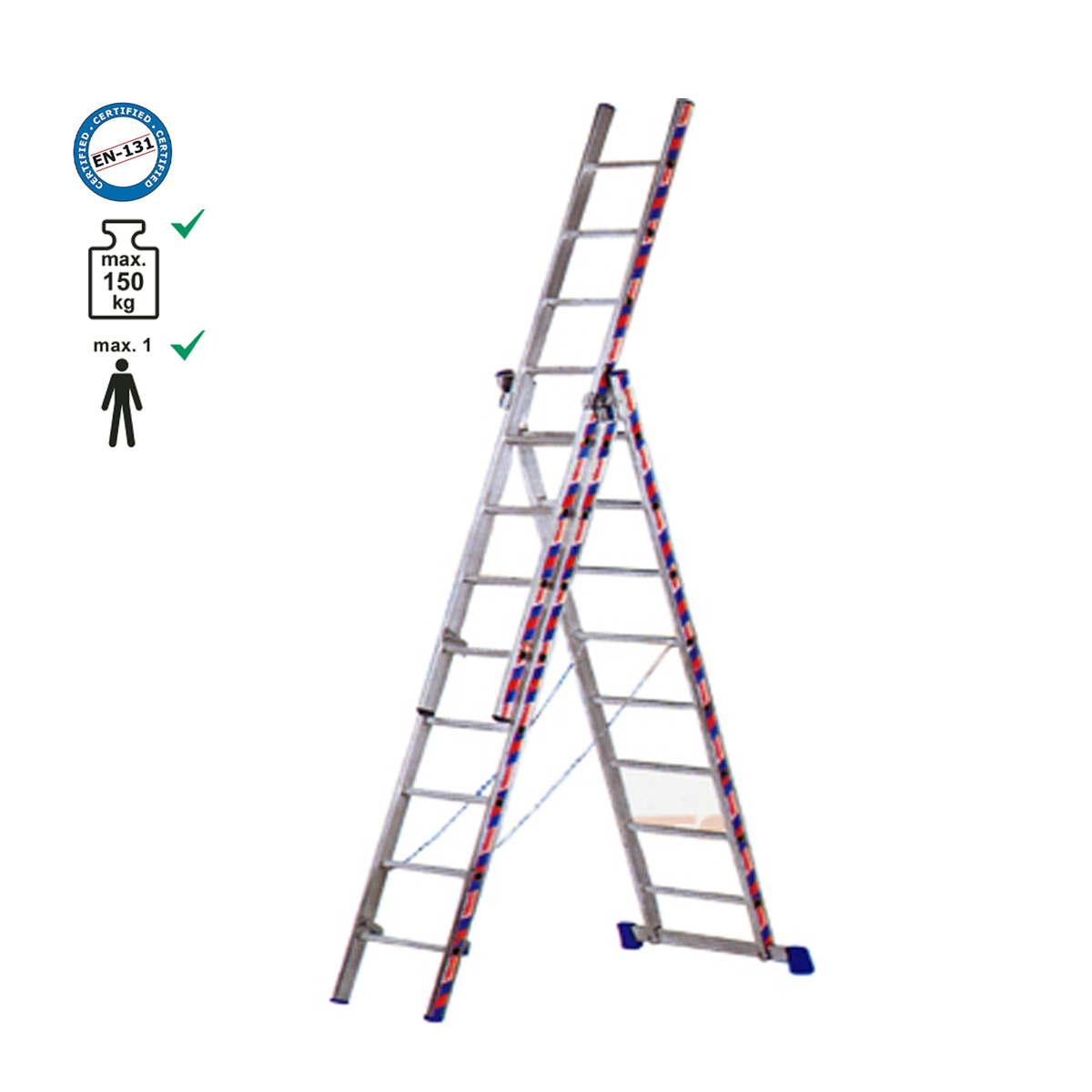 Η τριπλή επαγγελματική σκάλα αλουμινίου με 33 σκαλιά είναι κατάλληλη για οικιακή, ιδιωτική και επαγγελματική χρήση σε εσωτερικούς χώρους. Οι ιμάντες συγκράτησης των τεμαχίων σε μορφή Λ διευκολύνουν τη μεταφορά και αποθήκευση. Η βάση-πέλμα διαθέτει αντιολισθητικά πατάκια για επιπλέον ευστάθεια.