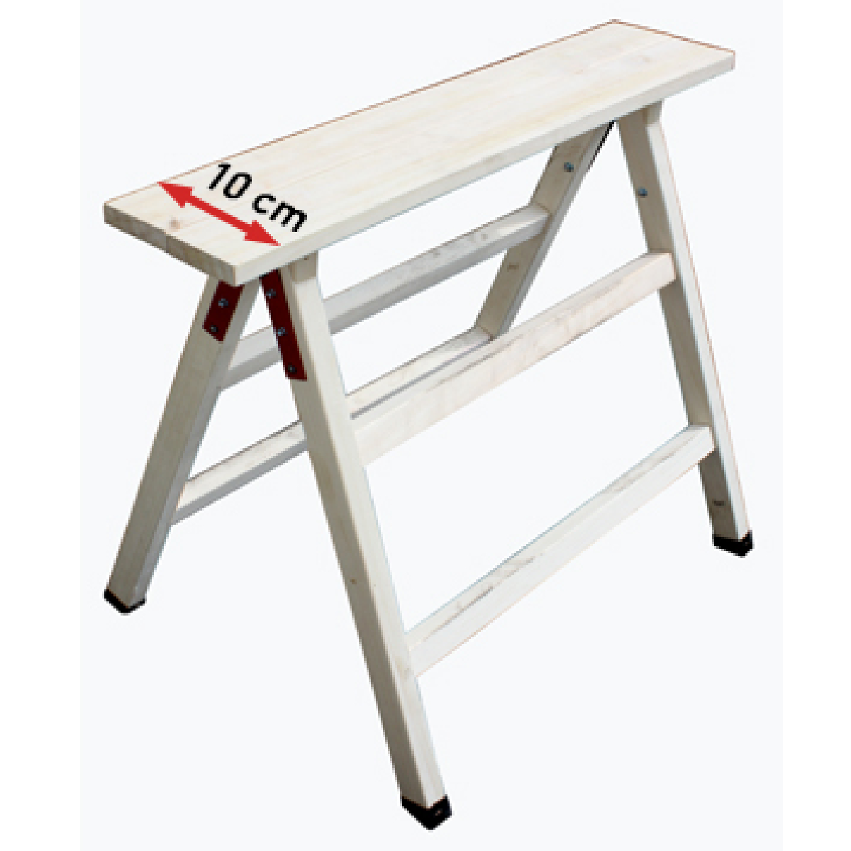 Η ξύλινη καβαλέτο σκάλα με πλάτος 10cm είναι κατάλληλη για επαγγελματική και ερασιτεχνική χρήση. Με δύο σκαλία και ένα πλατύσκαλο, παρέχει σταθερή στήριξη για διάφορες εργασίες. Το μήκος της είναι 85cm, το ύψος 92cm, και το φάρδος των σκαλιών είναι 2 x 5 cm.