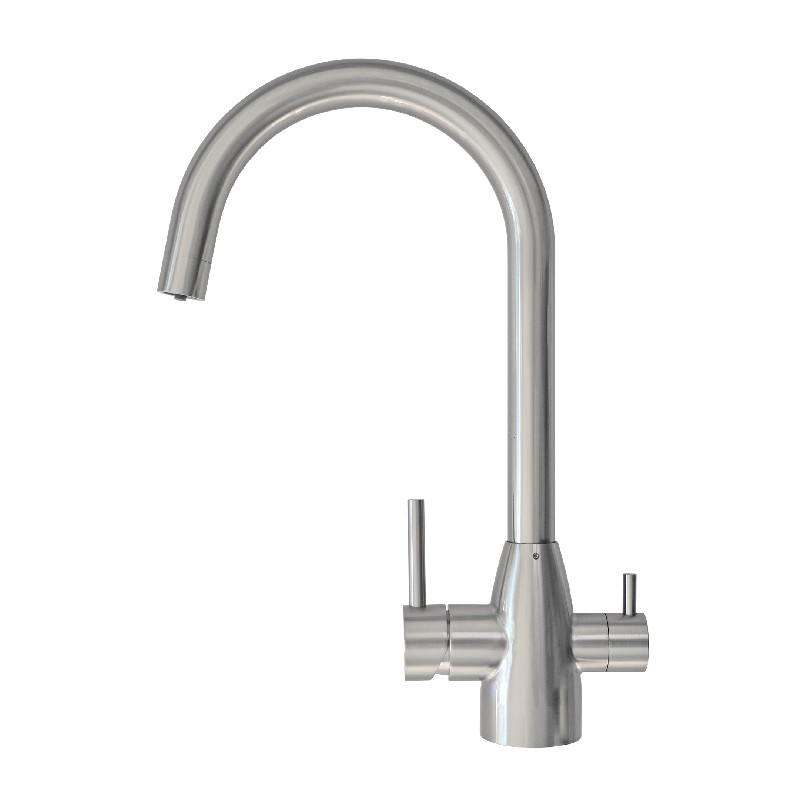 Τρίοδη καμπυλωτή βρύση κουζίνας για κρύο / ζεστό και φιλτραρισμένο νερό. Είναι κατασκευασμένη από ανοξείδωτο ατσάλι 304. Είναι συμβατή με τα περισσότερα φίλτρα νερού κάτω πάγκου και συστήματα αντίστροφης όσμωσης που κυκλοφορούν στην αγορά. Αντικαθιστά την υπάρχουσα βρύση που έχετε, σε περίπτωση που δεν θέλετε να τρυπήσετε τον πάγκο σας για να τοποθετηθεί ξεχωριστό βρυσάκι για τη σύνδεση του φίλτρου νερού κάτω πάγκου. Περιλαμβάνει όλα τα εξαρτήματα που είναι απαραίτητα για τη σύνδεση.