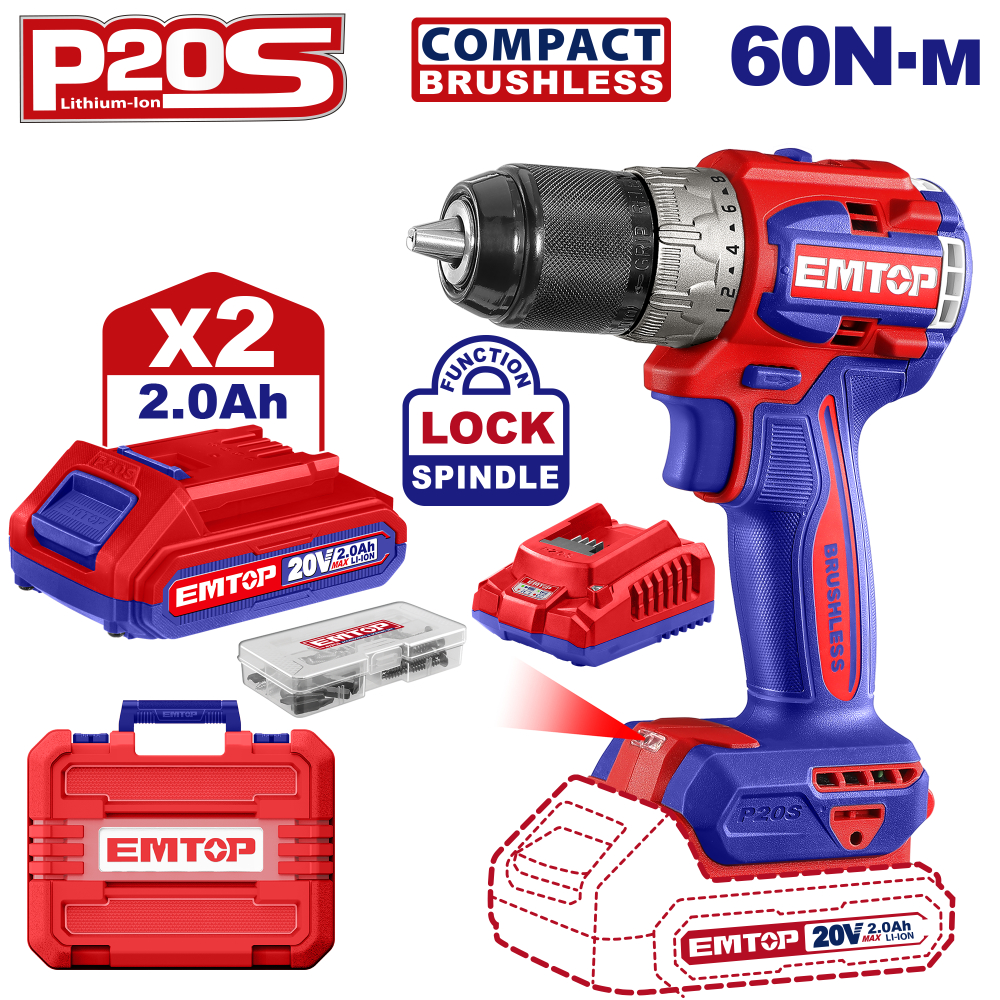 "Το brushless δραπανοκατσάβιδο της εταιρίας EMTOP διατίθεται με μία μπαταρία 2Ah/20V και ταχυφορτιστή 20V. Κατασκευασμένο με μηχανικό κιβώτιο 2 ταχυτήτων και αυτόματο κλείδωμα τσοκ. Διαθέτει ενσωματωμένο LED για εργασίες σε σημεία που δεν υπάρχει επαρκής φωτισμός.