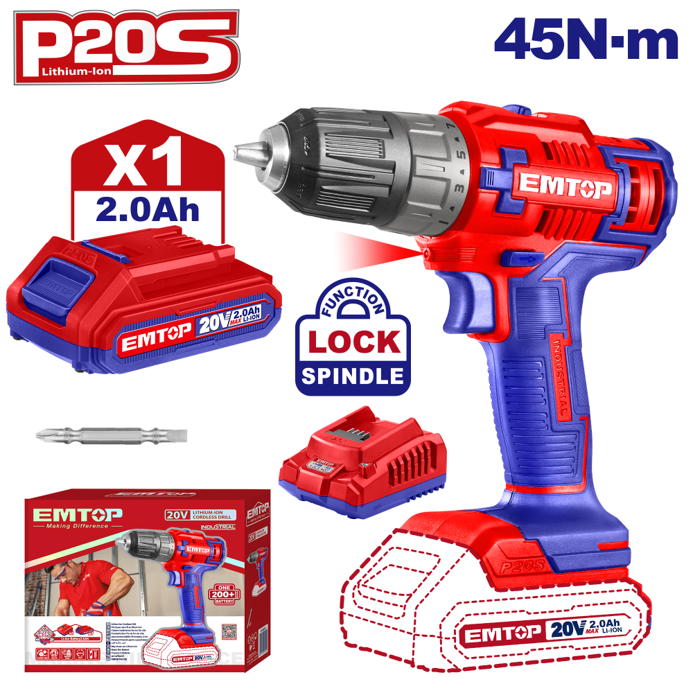 "Το δραπανοκατσάβιδο της εταιρίας EMTOP διατίθεται με μία μπαταρία 2Ah/20V και ταχυφορτιστή 20V. Κατασκευασμένο με μηχανικό κιβώτιο 2 ταχυτήτων, διαθέτει και ενσωματωμένο LED για εργασίες σε σημεία που δεν υπάρχει επαρκής φωτισμός.