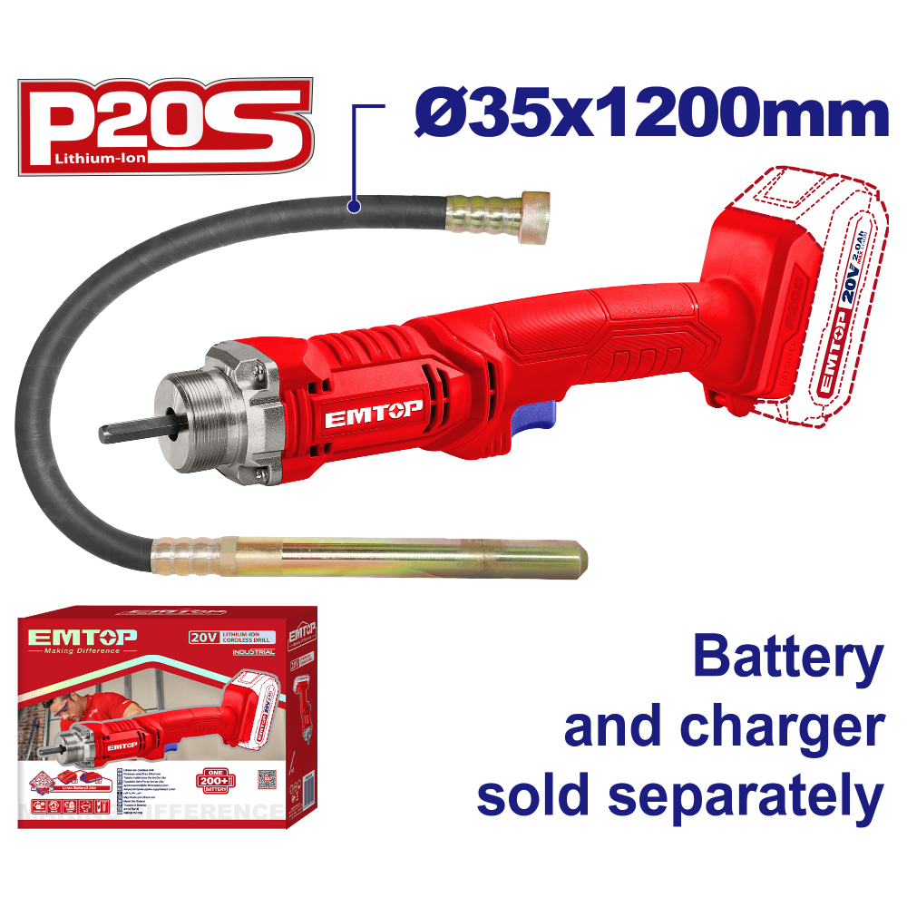 "EMTOP δονητής μπετού μπαταρίας 20V με μαρκούτσι Φ35x1200mm, ιδανικό για επαγγελματίες.