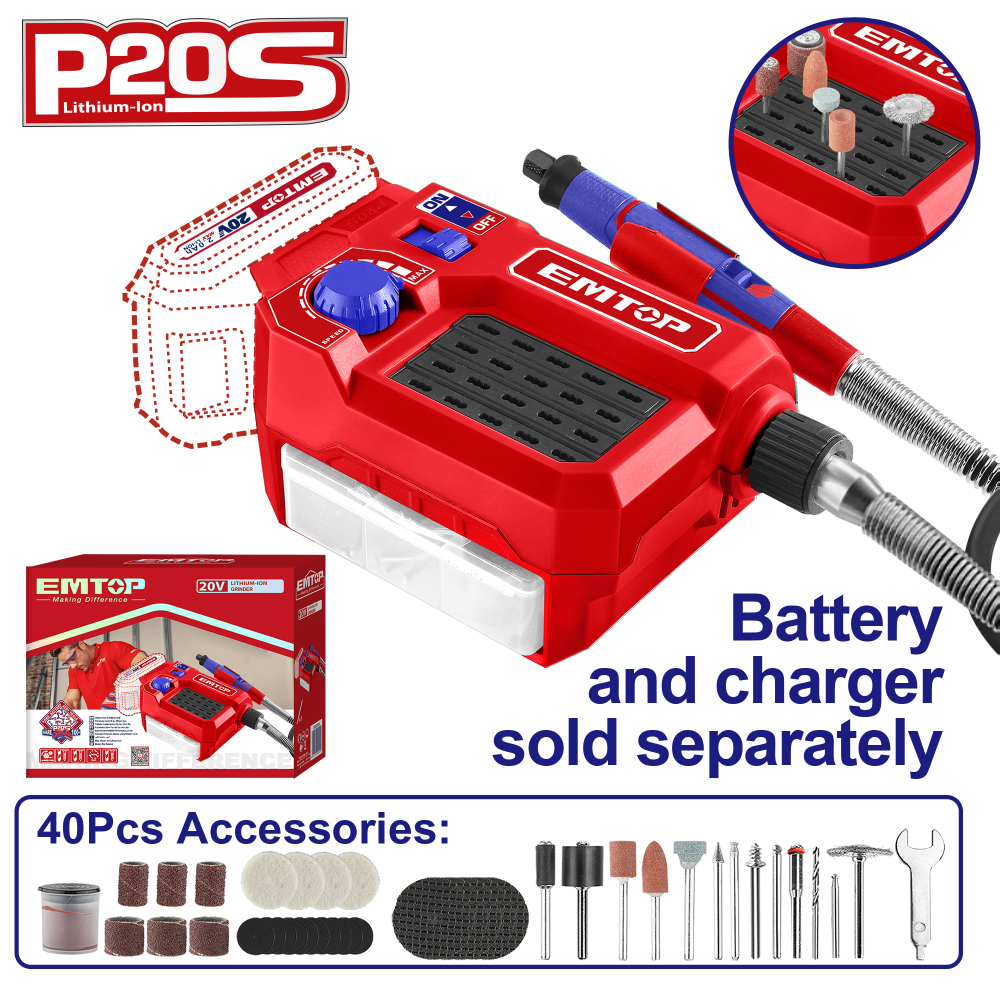 "EMTOP περιστροφικό πολυεργαλείο μπαταρίας λιθίου 20V. Κατάλληλο για οποιαδήποτε λεπτομερή ερασιτεχνική εργασία όπως σκάλισμα, χάραξη, φρεζάρισμα, κοπή, τρίψιμο, λείανση, ακόνισμα, γυάλισμα και καθαρισμό.