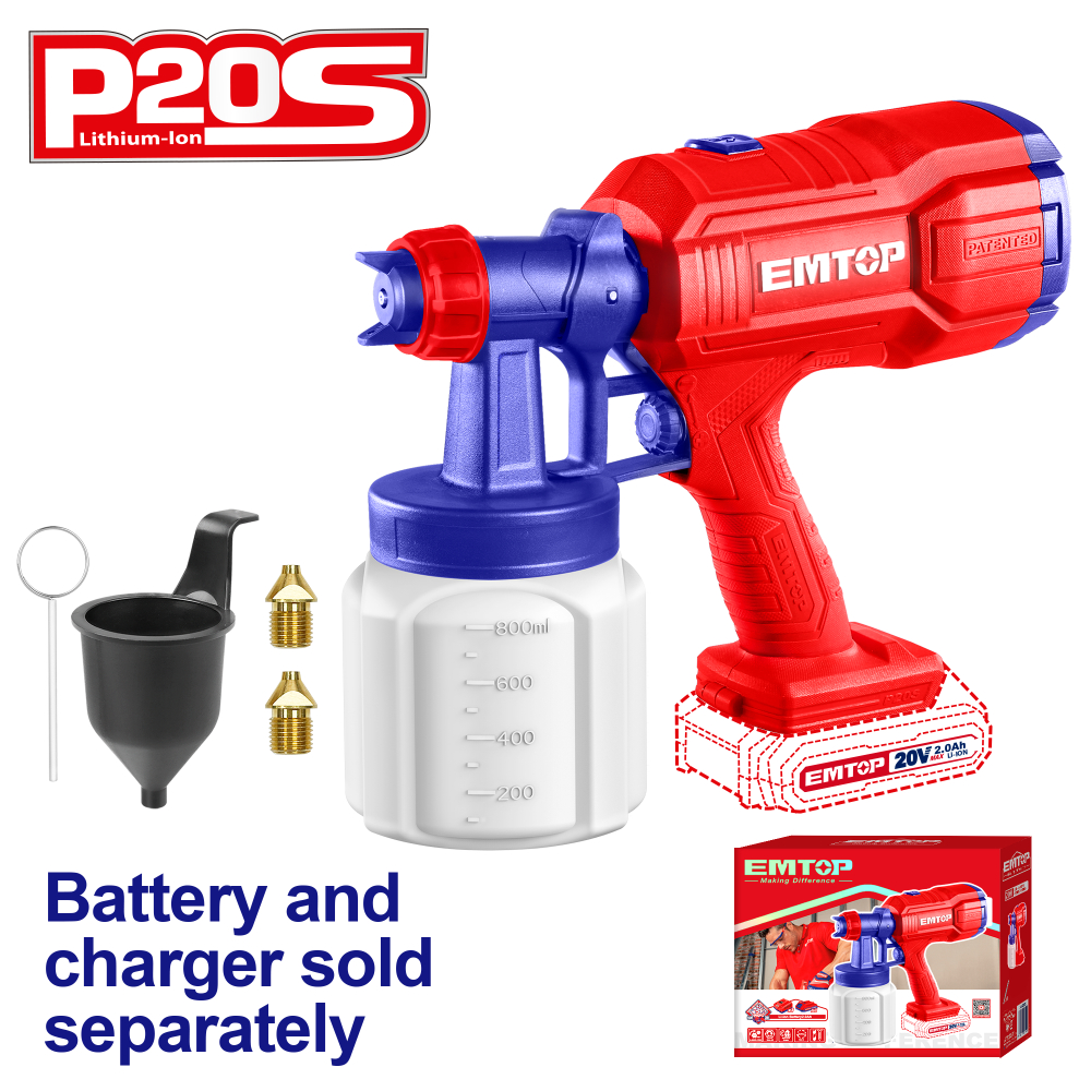 Emtop πιστόλι βαφής μπαταρίας 20V με δοχείο μεζούρα και βελόνα καθαρισμού.
