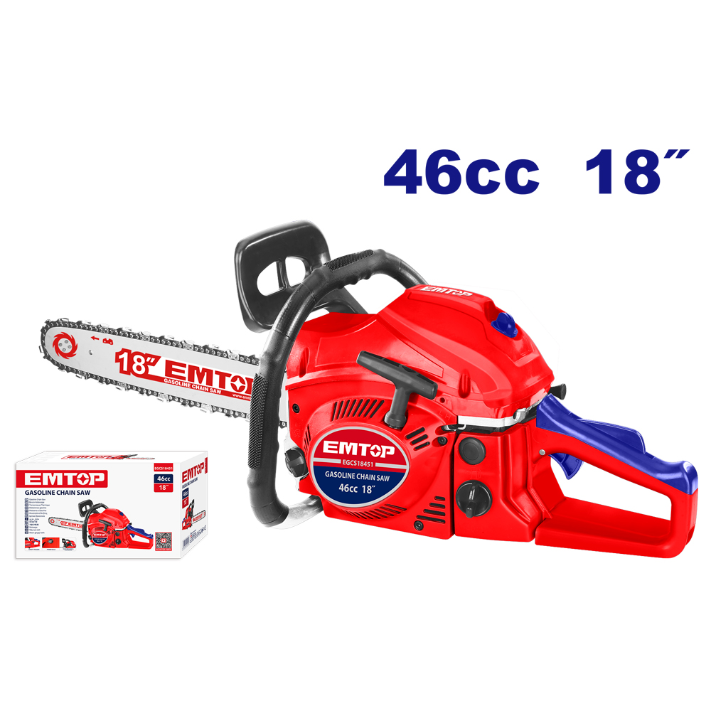 Το αλυσοπρίονο της Emtop λειτουργεί με βενζινοκινητήρα 2.2 ίππων και κυβισμό 46cc.