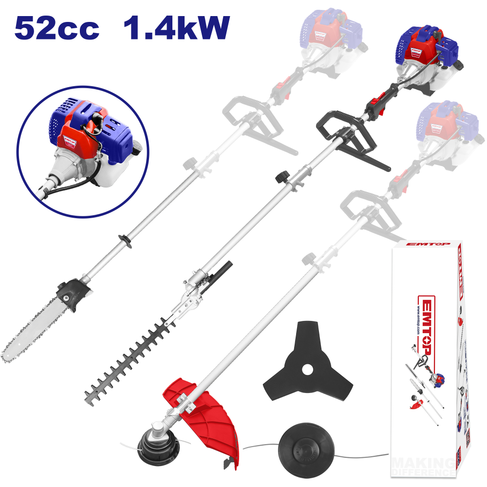 "Πολυμηχάνημα κήπου βενζίνης EMTOP, χρησιμοποιείται στις εργασίες όπως περιποίηση και ανανέωση θάμνων, κλάδεμα δέντρων και καθαρισμός χόρτων. Ενδείκνυται για απαιτητική ερασιτεχνική και επαγγελματική χρήση λόγω αυτονομίας σε τροφοδοσία και μεγάλης διάρκειας εργασίας.