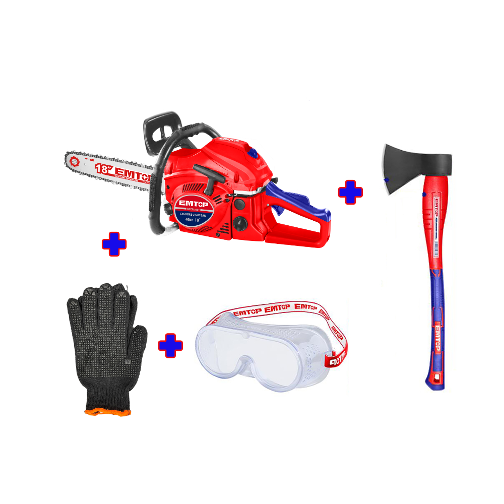Emtop πακέτο προσφοράς αλυσοπρίονο βενζίνης 46cc, τσεκούρι 1250g, γυαλιά και γάντια προστασίας.