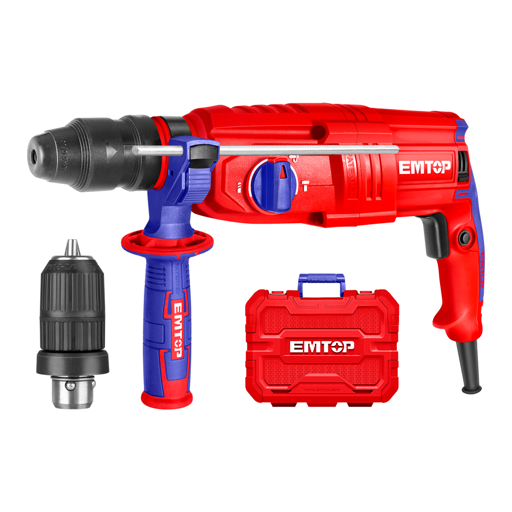 Τάση και ισχύς: Το περιστροφικό σκαπτικό EMTOP λειτουργεί με τάση 220-240V~50/60Hz και διαθέτει ισχύ εισόδου 800W. Αυτός ο συνδυασμός τάσης και ισχύος εξασφαλίζει αποτελεσματική απόδοση διάτρησης.