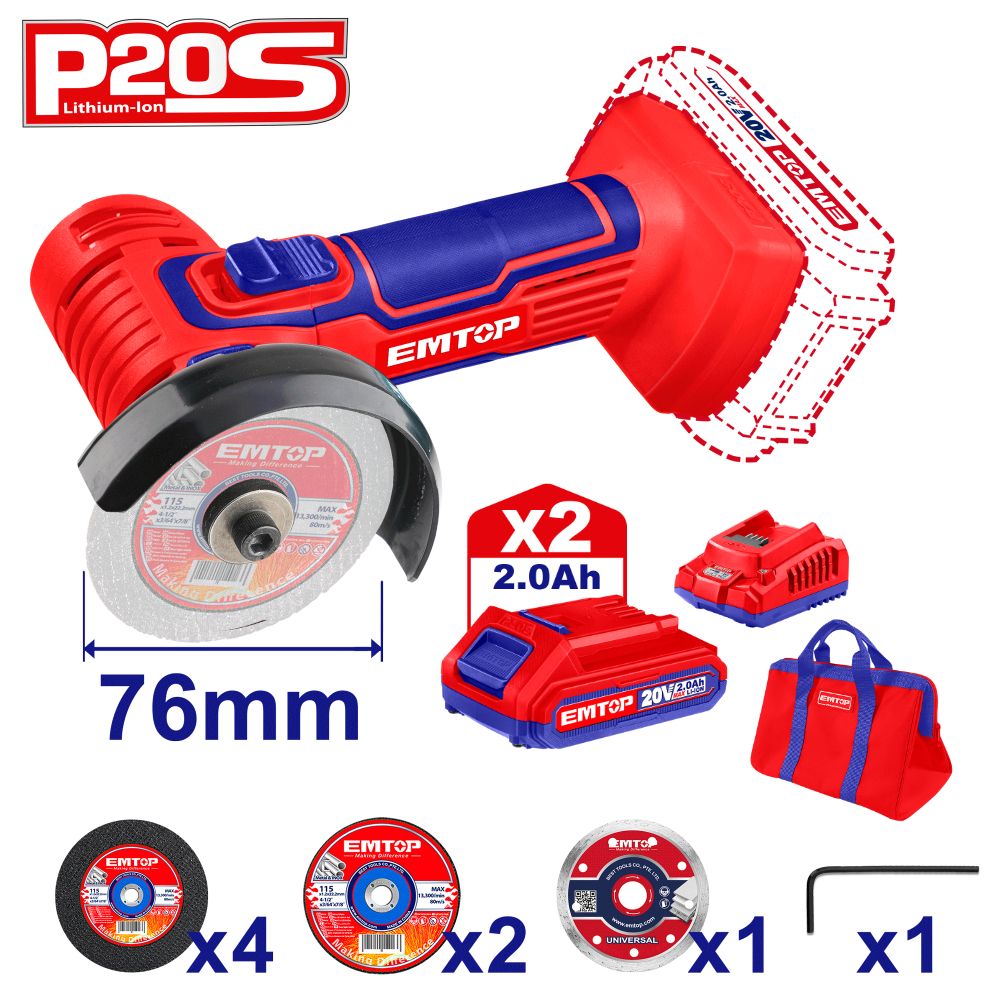 EMTOP ΜΙΝΙ ΓΩΝΙΑΚΟΣ ΤΡΟΧΟΣ ΜΠΑΤΑΡΙΑΣ 20V/2x2Ah ELAG7601SE