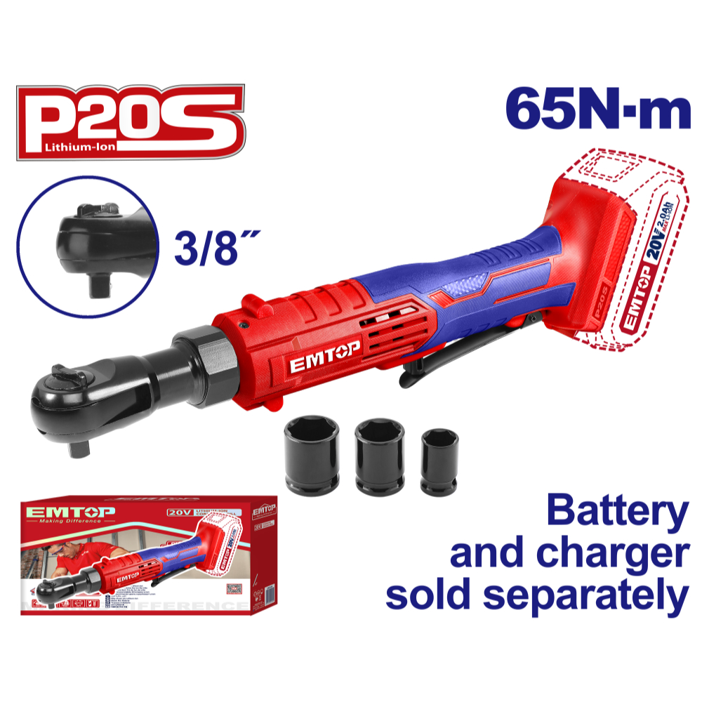 "EMTOP δυναμόκλειδο μπαταρίας 20V 65Nm με αρσενική υποδοχή 3/8’’, ιδανική για επαγγελματίες και συνεργεία.