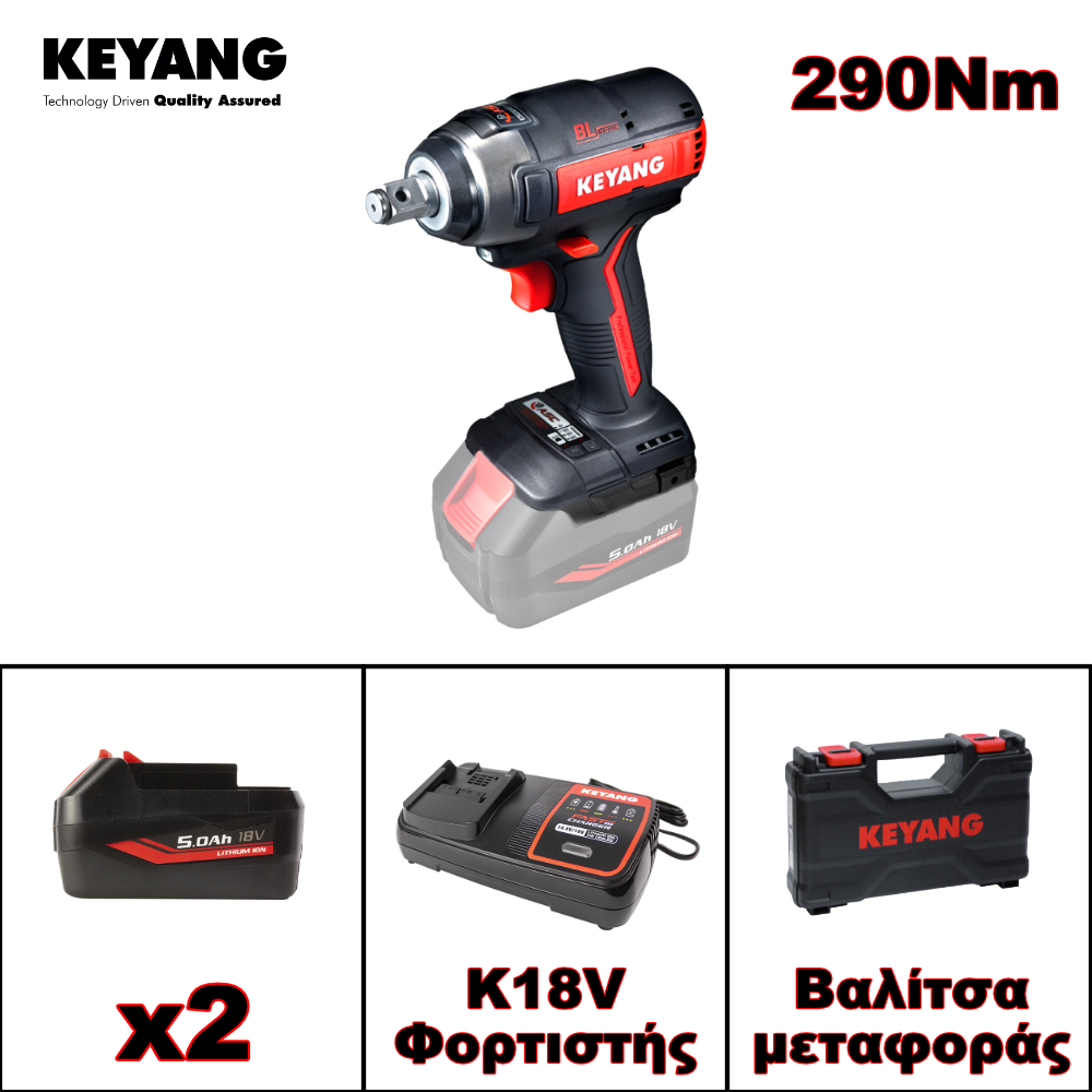 Το Παλμικό Μπουλονόκλειδο KEYANG IW18BLA προσφέρει ισχυρό μοτέρ αποτελούμενο απο μεταλλικά γρανάζια τιτανίου και κιβώτιο 3+1 ταχυτήτων, αγγίζοντας ροπή στρέψης τα 290N.m, και φτάνοντας τις 2.600 στροφές χωρίς φορτίο. Οι κρούσεις αγγίζουν τα 3,400bpm ανά λεπτό. Η μπαταρία περιλαμβάνει ένδειξη LED υποδεικνύοντας τον υπολειπόμενο χρόνο λειτουργίας, καθώς και εργονομική ποιότητα κατασκευής. Διαθέτει ταχυφορτιστή, με διάρκεια πλήρης φόρτισης τα 15'. Επίσης περιλαμβάνει ηλεκτρονική πλακέτα με επεξεργαστή (εγκέφαλο) ο οποίος αναγνωρίζει την μέγιστη εκπόνηση στρέψης και την πιθανότητα υπερθέρμανσης του μοτέρ.