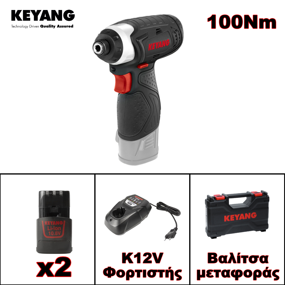 Το παλμικό κατσαβίδι KEYANG DID1202L, προσφέρει ισχυρό μοτέρ αποτελούμενο από μεταλλικά γρανάζια τιτανίου, αγγίζοντας ροπή στρέψης τα 100N.m με 3.400 κρούσεις ανά λεπτό, και φτάνοντας τις 2.400 στροφές χωρίς φορτίο. Το σώμα περιλαμβάνει ένδειξη LED για τη στάθμη της μπαταρίας καθώς και εργονομική ποιότητα κατασκευής. Διαθέτει ταχυφορτιστή, με διάρκεια πλήρης φόρτισης τα 20'.