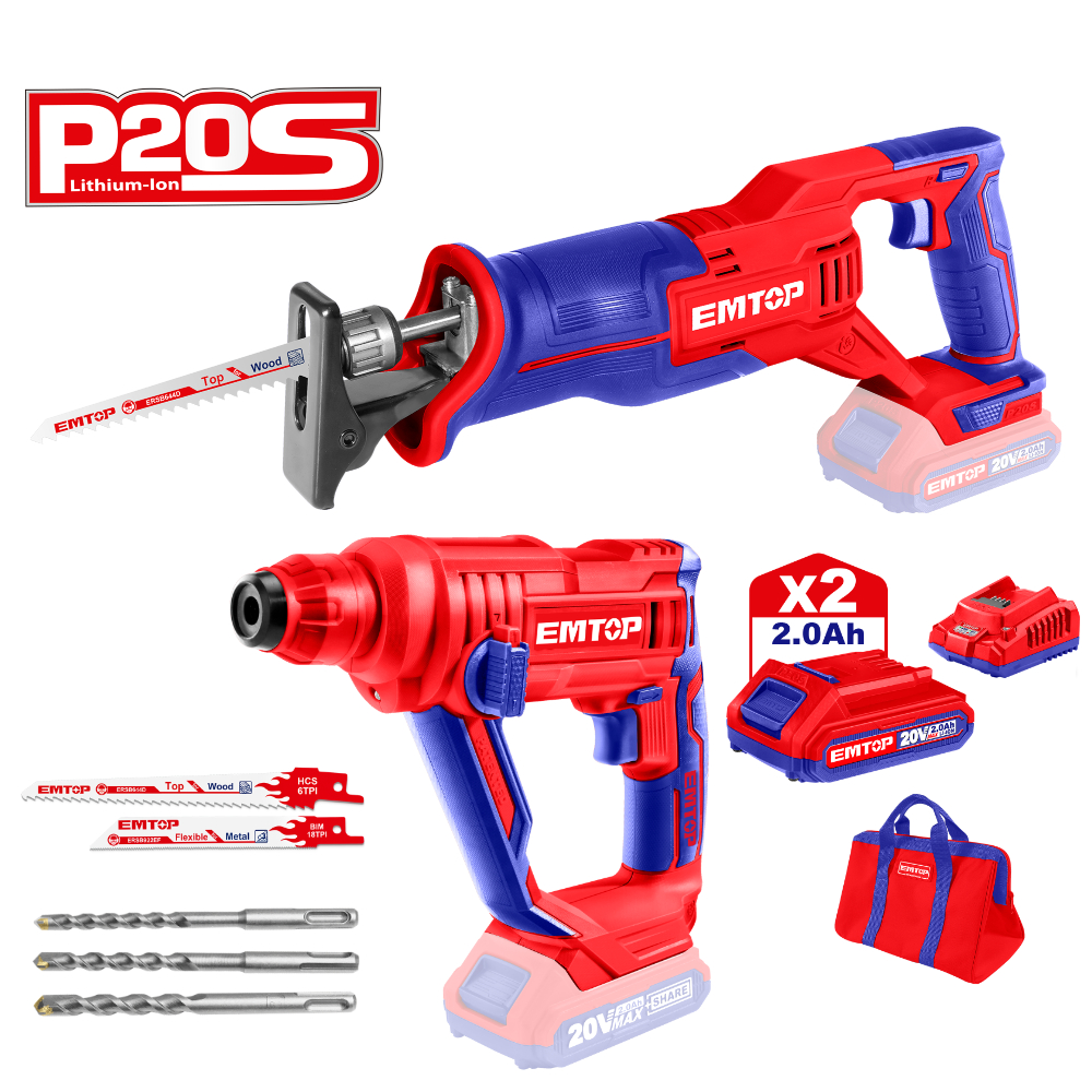1 Περιστροφικό Σκαπτικό Πιστολέτο (ELRH201601), 1 Σπαθόσεγα (ELRS201152), 2 μπαταρίες 2Ah (EBPK2001), 1 Ταχυφορτιστή (EFCR20411E), 3 Διαμαντοτρύπανα Νο. 6,8,10, Μαχαίρια σέγας, 1 Τσάντα μεταφοράς.