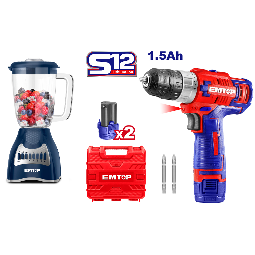 1 Δραπανοκατσάβιδο μπαταρίας 45Nm (ECDL12622), 1 Μπλέντερ 500W (EZZ5009A), 2 μπαταρίες 1,5Ah (EBPK12153E), 4 Μύτες PH/SL, 1 Βαλίτσα μεταφοράς.