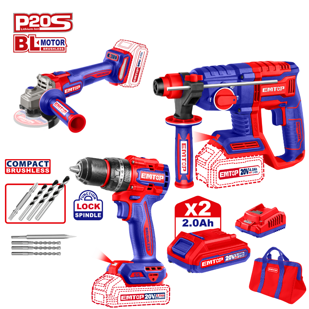 1 Κρουστικό Δραπανοκατσάβιδο μπαταρίας 60Nm (ECIDL205581), 1 Γωνιακό τροχό 115mm (ELAG21154), 1 Περιστροφικό Σκαπτικό Πιστολέτο 2J (ELRH20208), 2 μπαταρίες 2Ah (EBPK2001), 1 Ταχυφορτιστή (EFCR20411E), 6 Τρυπάνια, 1 Βελόνι, 2 μύτες PH/SL, 1 Τσάντα μεταφοράς.