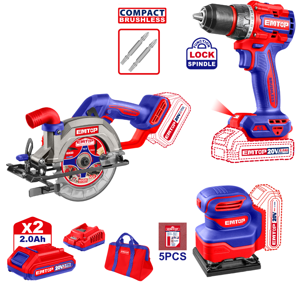 1 Κρουστικό Δραπανοκτσάβιδο (ECDL205581), 1 Δισκοπρίονο 140mm (ELCS1402), 1 Παλμικό τριβείο (ELSH2014) 2 μπαταρίες 2Ah (EBPK2001), 1 Ταχυφορτιστή (EFCR20411E), 5 Γυαλόχαρτα, 1 Τσάντα μεταφοράς.