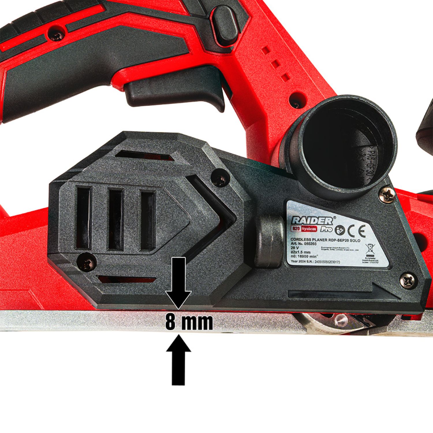 Η πλάνη της Raider σειρά R20 solo 82*1.5mm RDP-SEP20 055203 λειτουργεί με μπαταρία (ΔΕΝ ΠΕΡΙΛΑΜΒΑΝΕΤΑΙ) για ακόμη μεγαλύτερη εργονομία. Η λαβή της είναι με αντιολισθιτική επίστροση, ώστε να διευκολύνει τη χρήση. Ελαφρύ και εύχρηστο εργαλείο, κατάλληλο για επεξεργασία ξύλινων επιφανειών. Διαθέτει κουμπί ασφαλείας που κλειδώνει τη σκανδάλη από ακούσια ενεργοποίηση και αυτόματο προστατευτικό για την προστασία των λεπίδων και της επιφάνειας, σε περίπτωση απρόσεκτης τοποθέτησης της πλάνης σε επίπεδη βάση με περιστρεφόμενες λεπίδες. Το κλειδί για τη ρύθμιση και την αλλαγή των λεπίδων είναι 7mm ενώ οι λεπίδες είναι ακονισμένες και από τις 2 πλευρές ώστε αν φθαρεί η μία πλευρά, να περιστρέφονται από την άλλη. Το σύστημα απομάκρυνσης σκόνης, σας επιτρέπει να διώχνετε τη σκόνη δεξιά ή αριστερά.