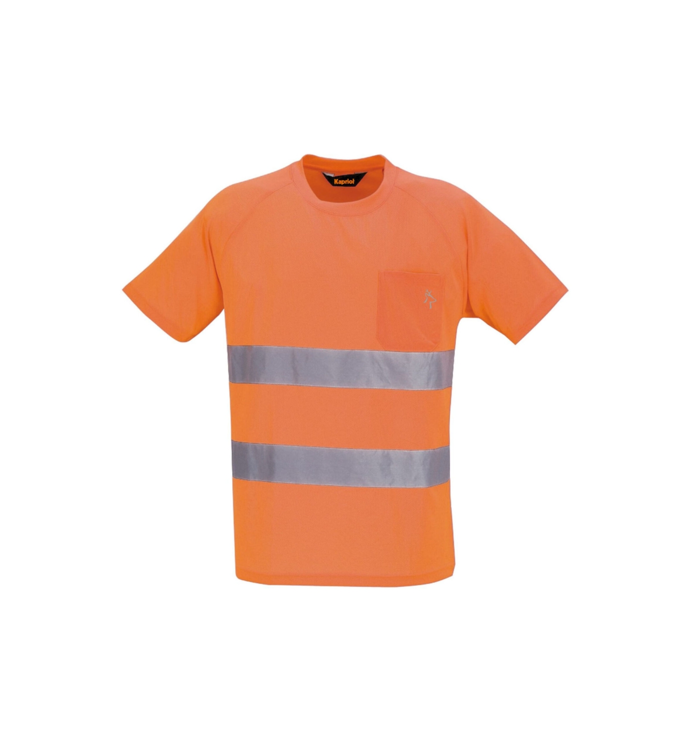 Κοντομάνικο μπλουζάκι χρώματος πορτοκαλί. Η χρήση χρωμάτων “Fluo” και ανακλαστικών ταινιών παρέχει μεγάλη ορατότητα σε όλες τις καιρικές συνθήκες για να εγγυηθεί τη μέγιστη ασφάλεια. ΤΕΧΝΙΚΑ ΧΑΡΑΚΤΗΡΙΣΤΙΚΑ & ΠΡΟΔΙΑΓΡΑΦΕΣ – μικρή τσέπη στο αριστερό στήθος – χρώμα υψηλής ορατότητας – 6 εκατοστά αντανακλαστικές ρίγες στο στήθος Κύριο ύφασμα: 100% ελαφρύς και αναπνεύσιμος πολυεστέρας.