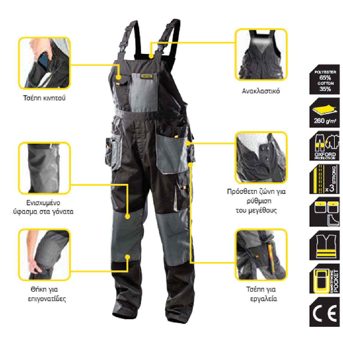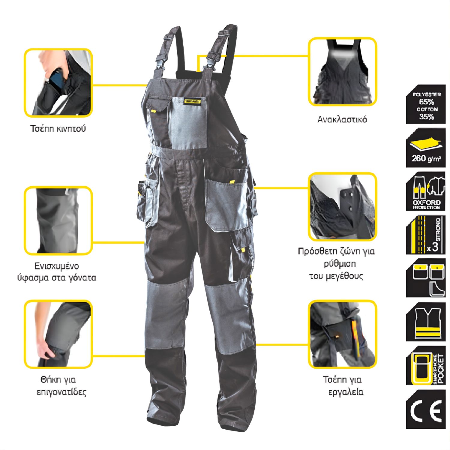 Η τιράντα φόρμα Top Master σε μέγεθος XXL είναι κατασκευασμένη από υψηλής ποιότητας υλικό, με το 65% πολυεστέρα και το 35% βαμβάκι για ανθεκτικότητα και άνεση. Η μαύρη απόχρωση προσδίδει επαγγελματική εμφάνιση, ενώ η ειδική σχεδίαση με τιράντες εξασφαλίζει ελευθερία κινήσεων.