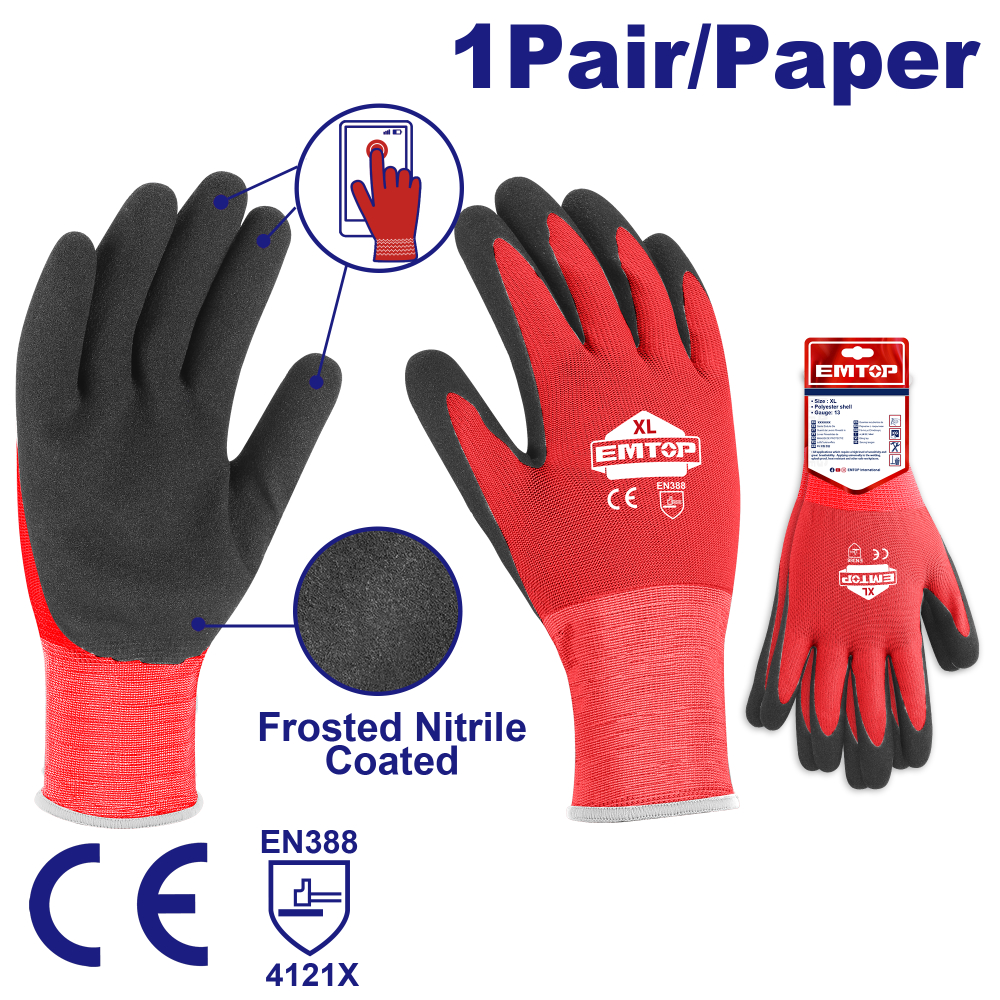 Emtop γάντια εργασίας με επικάλυψη μαύρου νιτριλίου, έχουν εξαιρετικό κράτημα σε ξηρό και λιπαρό περιβάλλον. Κατάλληλα για όλες τις εργασίες που απαιτούν επιδεξιότητα.